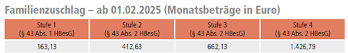 Der kinderbezogene Anteil im Familienzuschlag beträgt für die ersten beiden zu berücksichtigenden Kinder jeweils 249,50 Euro, das dritte und jedes weitere zu berücksichtigende Kind jeweils 764,66 Euro